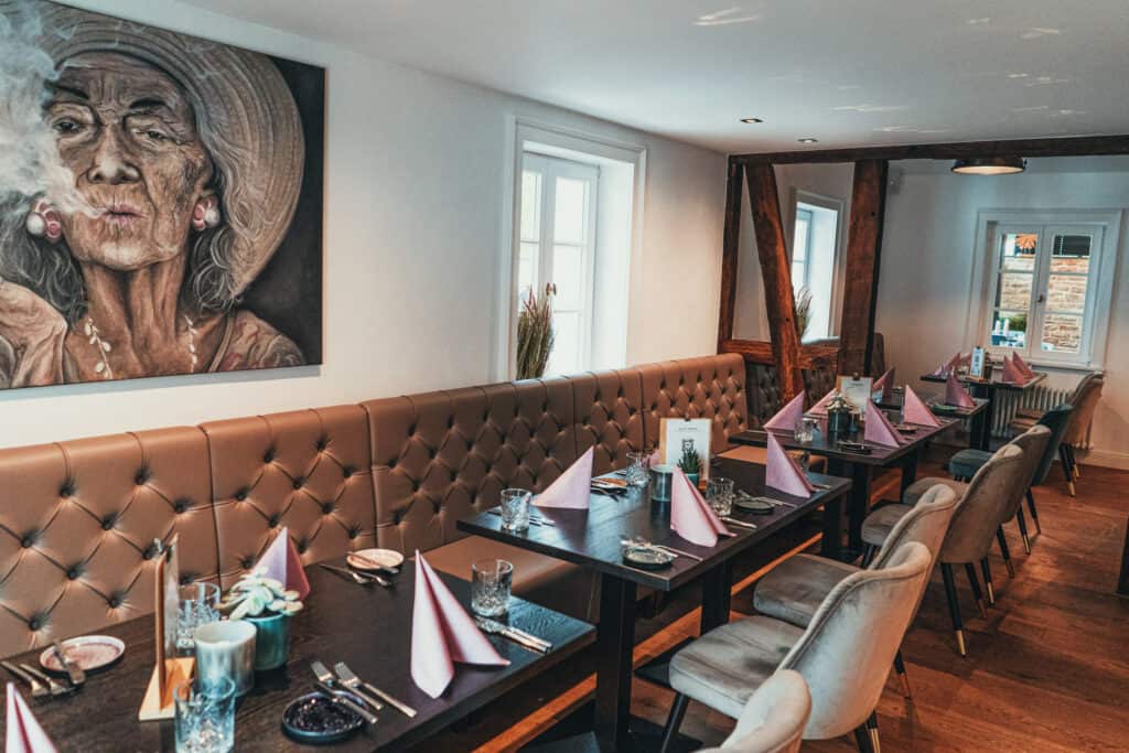 Das Obergeschoss bietet nicht nur einen Blick über die Straße durch das historische Nümbrecht, sondern auch ein helles und warmes Ambiente. Sowohl im Tagesgeschäft als auch bei Hochzeiten, Firmenevents und anderen Anlässen fühlen sich hier alle wohl.